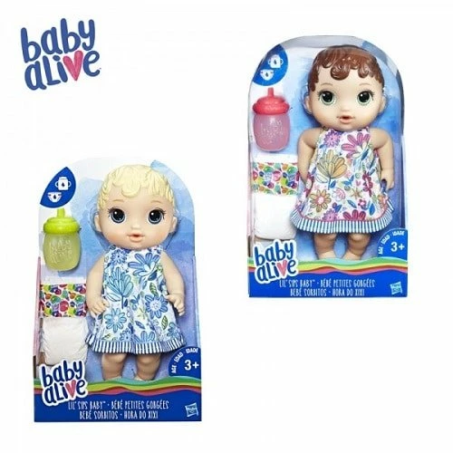 On no! Baby needs her bottle! Little ones will love pretending to take care of a real baby with the Baby Alive Lil Sips Baby! Just fill the included bottle with water and feed her. This little doll drinks and wets like a real baby. Little ones will love feeding her, changing her, and taking care of her like a real mommy or daddy. Doll comes wearing an adorable floral dress, and includes a bottle and diaper.