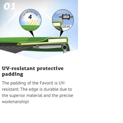 - Long lifespan of the protective edge due to an upper and lower layer of super thick UV resistant PVC