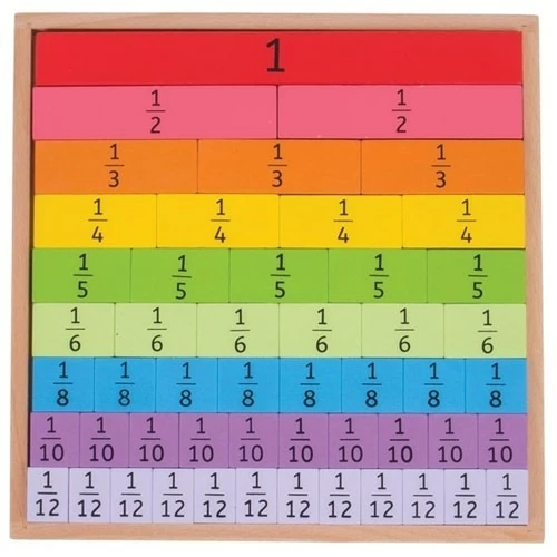 This fantastically simple educational toy allows children to get hands-on with fractions, providing a visual and tactile way to teach fractions and their relationships. Colour coded pieces help little ones to visualise and identify fractions with ease as they line up the tiles in the tray. The brightly coloured wooden pieces will ensure young minds stay fully engaged as they learn fractions from 1 to 1/12. Decimals can also be found on the back of each tile! A great way to develop basic math skills, colour recognition and hand/eye coordination. Made from high quality, responsibly sourced materials. Consists of 51 play pieces.