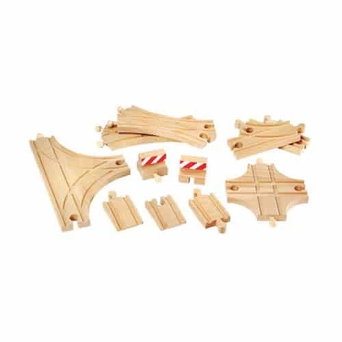 Expand the BRIO wooden railway system in all new directions with this multi functional pack of switches and accessories.