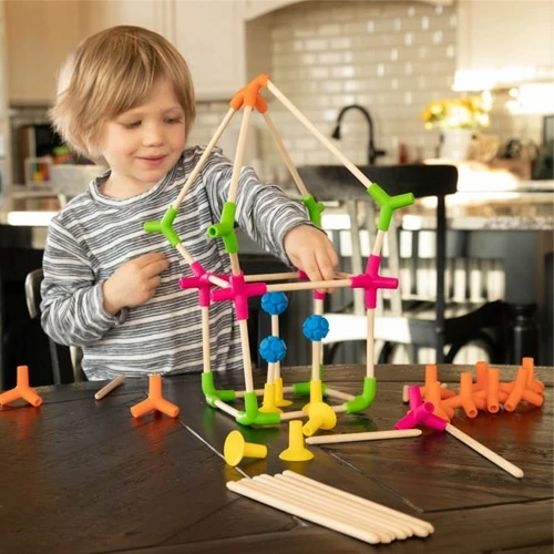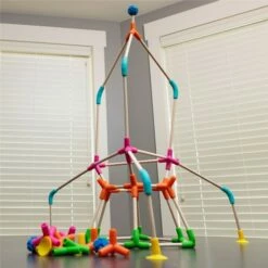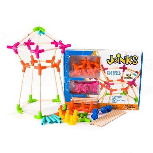 Flex, connect, build, play – JOINK! Colorfully constructed, brilliantly designed, Joinks engage the fingers and mind in a fantastic building experience. Fun to say, and even better to play, Joinks attracts inventors of all ages. From playroom to universities, toddler to teacher, simple to complex, Joinks designs are wide and diverse. Wooden dowels join easily with quality 100% silicone connectors. One simple push and the dowels sit tight for a secure fit. Time for de-construction? One simple pull and “POP” the silicone slides off with a delightful sound. Curious building has found its match. Innovative building has arrived! One look at the colorful pieces and hands start grabbing. Joinks connectors reach out in all directions – one, two, three, four and even FIVE prong connecting pieces conform creativity to your definition. Connecting prongs bend and flex for customised construction. Silly creatures, expressive forms, 3D geometric shapes, chemistry and molecular models, irregular structures… easily add, remove or swap sticks. Bend them into place, Joinks are eager to please and flex quickly to your every whim. Joinks innovative components include: 10 – 7.5 Cm dowels 15 – 12.5 Cm dowels 12 – 20.3 Cm dowels 4 nubby balls, 1 connection 6 suction cup connectors, 1 prongs 5 magenta connectors, 5 prongs 6 teal connectors, 2 prongs 8 green connectors, 3 prongs 10 orange connectors, 4 prongs It’s time to bend the rules and let imagination be your guide – JOINKS!