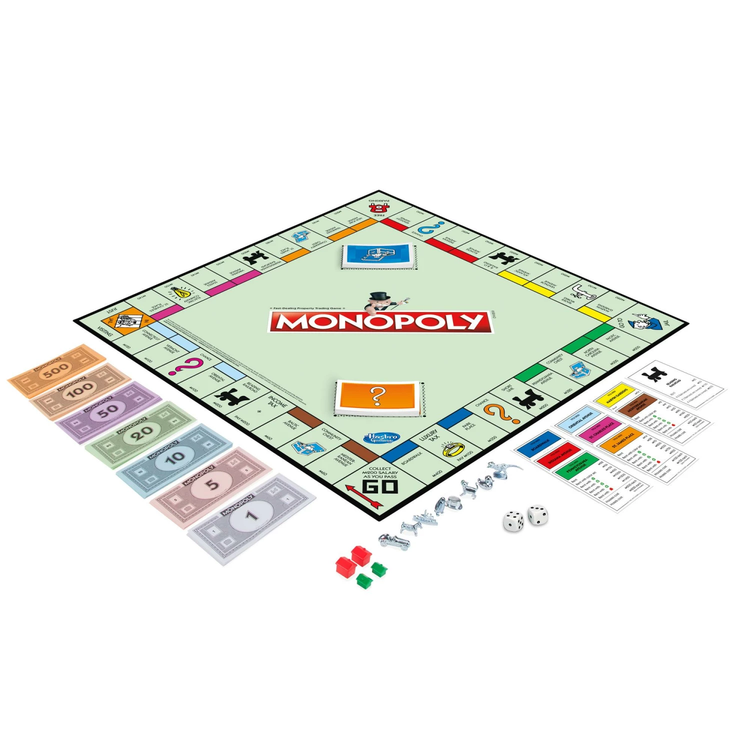 Includes gameboard, 8 Tokens, 28 Title Deed Cards, 16 Chance Cards, 16 Community Chest Cards, 32 Houses, 12 Hotels, 2 Dice, Money Pack and instructions.