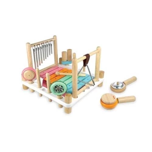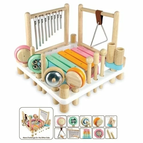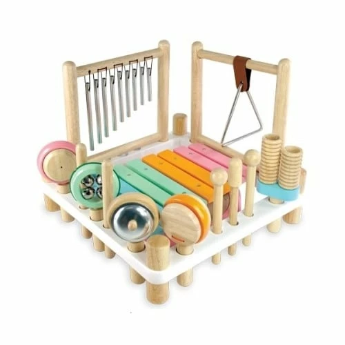 10 different sound and music experiences in a sturdy rubberwood frame. Includes xylophone, drum, tubular chimes, triangle, cymbal, bells, maracas, castanet, double guiro, and pair of rhythm sticks plus 2 strikers and 1 scraper. Every part is stored in its own dedicated slot around the frame but can be flat packed for easy storage. Flip the main frame to reveal a colouful drum. Produced from sustainable rubber wood and finished with non toxic child safe paints and laquers. This is an early learning discovery toy; not a precision musical instrument. It’s manufactured using sustainable timber that varies naturally in density and pitch.