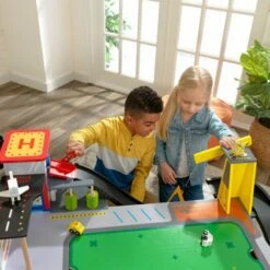 The fun goes up with the multi-level KidKraft Freeway Frenzy Raceway Set and Table from KidKraft. Featuring a big, circular ramp, a landing pad for planes and a tower with a rotating crane, this train, plane and activity table inspires tons of exciting play. Lift up the center lid to discover much-needed hidden storage. Flip the lid over and use as a building brick surface. Cars can race around, up, down and even into the great beyond. When cars need a pit stop, they can park in the side built-in storage area, keeping the surface clear for free play. Inspired by the hustle and bustle of a thriving city, the Freeway Frenzy Raceway Set has so many levels and modes of play, kids will feel the thrill of urban adventures for years to come!