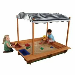 Help turn your backyard into an oasis for your children with the addition of the wooden KidKraft Outdoor Sandbox with Canopy. This upscale cabana-style sandbox is made of weather-resistant wood with plenty of space for kids to dig in the sand all day. The navy and white striped canvas canopy provides much-needed shade for children. The raised sides of the box give parents and kids who don’t want to sit entirely in the sand a place to sit and observe. Two plastic bins are inset into one end, giving boys and girls separate sand and water sensory areas to explore texture and making smaller structures. They could also be used to store toys. When playtime is over, cover the sand with the included mesh cover to help protect it from critters during the evenings. Honey-colored wood complements any grownup patio furniture to give your backyard a cohesive look.