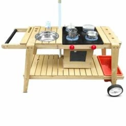 Get ready to cook up a storm with our Alfresco Mobile Kitchen. Perfect for messy fun outside, with an adjustable shade umbrella, and all the cooking accessories included. Built with premium weather protected timber and sturdy wheels, you’ll be ready to play anywhere with this mobile kitchen.