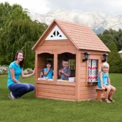 Brilliantly designed with 100% all natural cedar wood. Decorative white gable triangles, white windows, flower pot holders and a working dinner bell are all included. The outside of the playhouse encompasses a working door with an oval overhead door window.