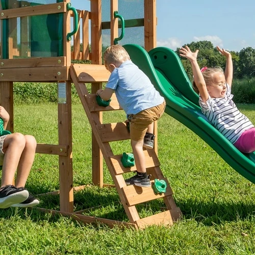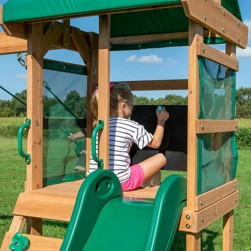 The Buckley Hill is the perfect playset for small yards and younger children. Whether you’re scaling the rock wall to race down the 6 foot super speedy slide or draw a master piece on the chalkboard, there is plenty of play options for everyone. Catch some shade under the covered 3 foot tall deck with 6 square feet of play space, or feel the breeze whipping through your hair swinging away on the two belt swings. Rope swing chains ensure that there will be no pinched fingers as your children enjoy hours of fun outdoors.