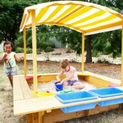 This sandpit comes with a nifty UV-protected canopy to keep your kids cool and in the shade during play.