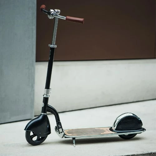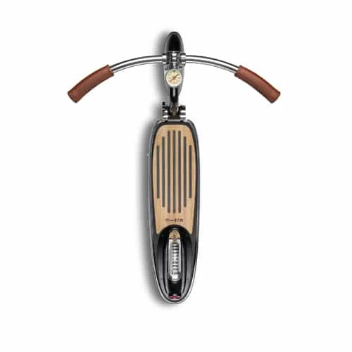 The Micro Navigator makes collectors and aesthetes hearts beat faster. In addition to the classic design, the ergonomic aluminum scooter offers maximum riding comfort thanks to the 200mm large, smooth-running PU wheels and the height-adjustable handlebar. In addition, the Micro Navigator can be parked effortlessly anytime and anywhere thanks to the integrated kick stand. The high-quality leatherette handles, the integrated compass on the handlebar and the wide deck with wooden design give the scooter its unique nostalgic look.
