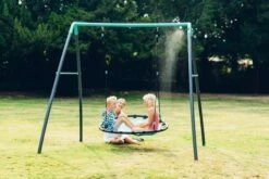The Plum Premium Metal Nest Swing with Mist has adjustable ropes and a comfy fabric nest swing that is big enough for two little ones; grown ups can also swing, relax and join the fun.